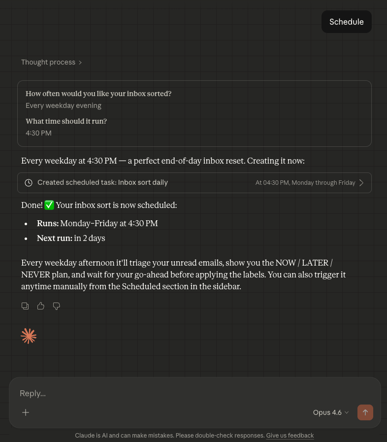 Note: scheduled tasks only run when your computer is awake and Claude Desktop is open